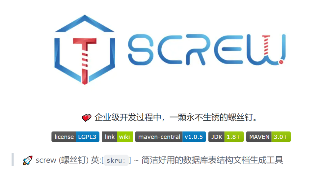 Screw是一款轻量级的数据库文档生成工具,支持多种数据库及文档格式,能够简化数据库文档的创建过程,并提供扩展功能如POJO生成。