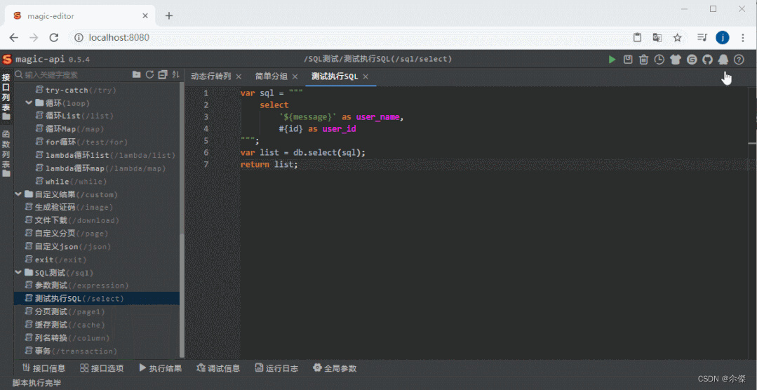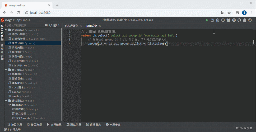 magic-api 是一个基于Java的接口快速开发框架,编写接口将通过magic-api提供的UI界面完成,自动映射为HTTP接口,无需定义Controller、Service、Dao、Mapper、XML、VO等Java对象即可完成常见的HTTP API接口开发