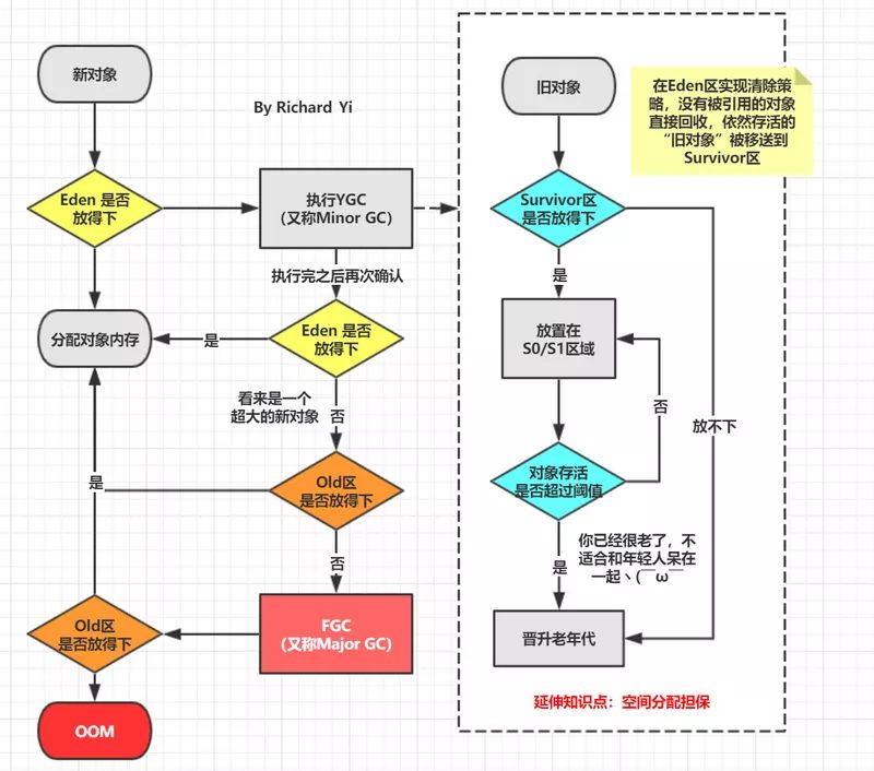 绝大部分对象在 Eden 区生成,当 Eden 区装填满的时候,会触发 Young Garbage Collection,即 YGC。垃圾回收的时候,在 Eden 区实现清除策略,没有被引用的对象则直接回收。依然存活的对象会被移送到 Survivor 区。Survivor 区分为 so 和 s1 两块内存空间。每次 YGC 的时候,它们将存活的对象复制到未使用的那块空间,然后将当前正在使用的空间完全清除,交换两块空间的使用状态。如果 YGC 要移送的对象大于 Survivor 区容量的上限,则直接移交给老年代。一个对象也不可能永远呆在新生代,就像人到了 18 岁就会成年一样,在 JVM 中 -XX:MaxTenuringThreshold 参数就是来配置一个对象从新生代晋升到老年代的阈值。默认值是 15,可以在 Survivor 区交换 14 次之后,晋升至老年代。