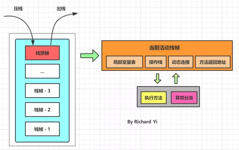 在活动线程中, 只有位于栈顶的帧才是有效的, 称为当前栈帧。正在执行的方法称为当前方法。在执行引擎运行时, 所有指令都只能针对当前栈帧进行操作。而 StackOverflowError 表示请求的栈溢出, 导致内存耗尽, 通常出现在递归方法中。