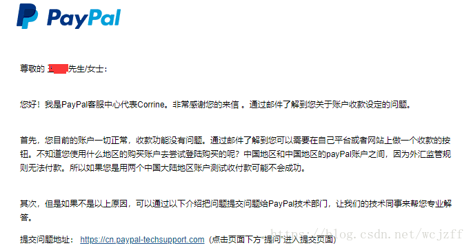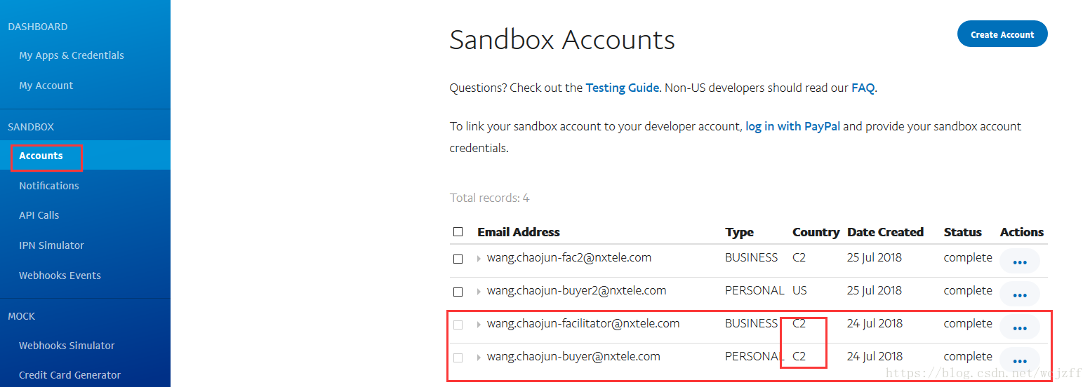 我画红框的那两个账号就是paypal自动分配给我的,但是这个又是一个坑!!!!!我们可以看到Country的值为C2(代表中国区账号),但是我们千万不要同时拿着这两个账号来进行沙箱收付款测试,因为Paypal规定中国地区和中国地区的账户之间无法实现付款。(下面左图是paypal客服回复的邮件内容;右图是当时支付时的报错!!)