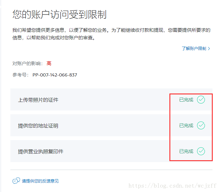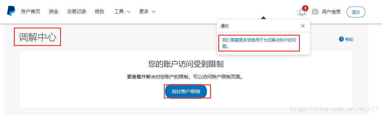 2、注册成功以后,账号登录要前往"调解中心"点击"前往账户限制"按钮,(完善账号信息,否则正式对接接口的时候,表单提交直接报错!!这是一个坑!!),需要提交以下文件:中国大陆居民身份证(正反面)和营业执照照片;这个审核过程一般1天左右的时间就可以完成。当然还需要邮箱验证等,这些都比较简单立刻能够操作完成。