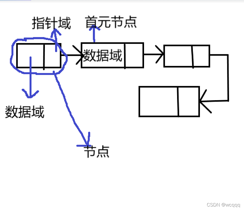 如图所示,所谓链表,就是由若干个节点组成,而每个节点就是由数据域和指针域组成。每个指针域指向下一个的首元节点