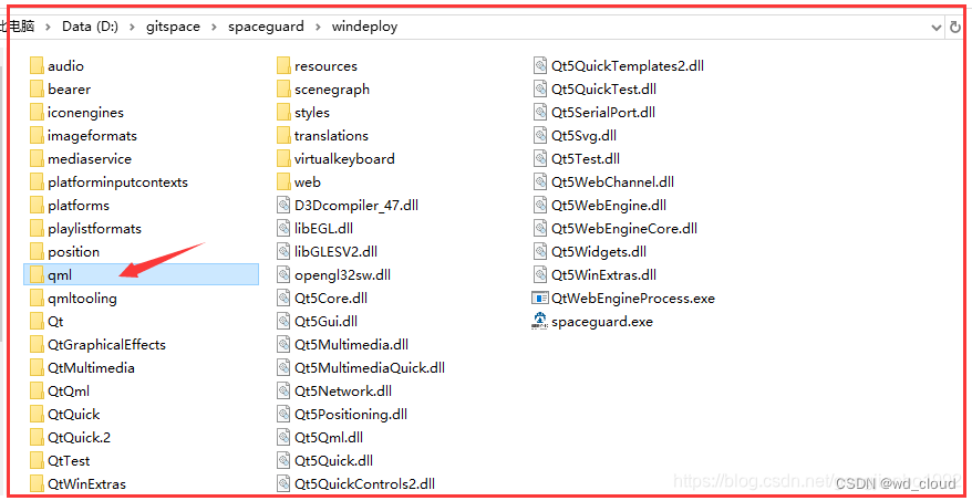 由于文件夹和dll太多了,接下来把目录整理下。先把qml文件夹下的带d的debug动态库删了(如果是直接全部copy过来的话),然后把windeploy打包过来的那些原qml目录下的大写Q开头的文件夹删了,原plugins文件夹下的新建个plugins文件夹放置,默认qml和plugins是平级的,所以不用写qt.conf文件指定。(暂时还没找到方法把这些原bin目录下的dll怎么整理到一个文件夹下)