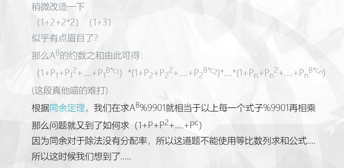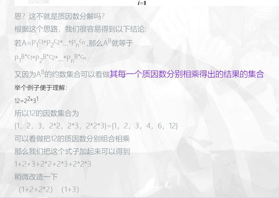 思路:要想求a得b次方得约数,可以先求出来a得约数求和,(质因数),然后在a得指数上面乘上b,就可以求出来了