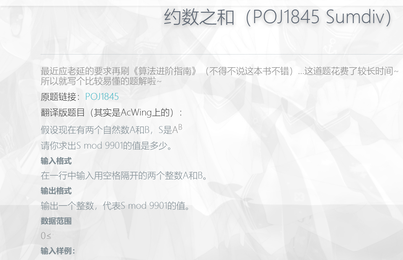 该程序使用快速幂算法和等比数列求和递归方法解决POJ1845问题,首先求出a的约数和(质因数分解),然后乘以b的指数模运算结果,得到a的b次方的约数和。