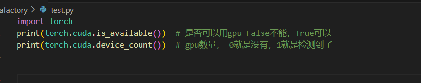 import torch print(torch.cuda.is_available()) # 是否可以用gpu False不能,True可以 print(torch.cuda.device_count()) # gpu数量, 0就是没有,1就是检测到了