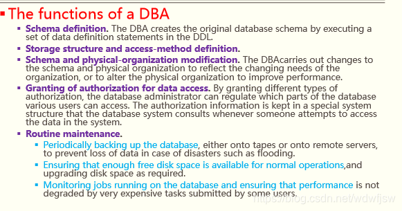DBA模式定义的功能。DBA通过在DDL中执行一组数据定义语句来创建原始的数据库模式。存储结构和访问方法定义。