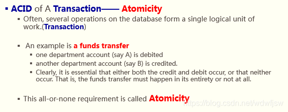 原子性——通常,数据库上的几个操作构成一个单一的逻辑工作单元。(事务)