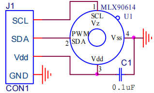 作为标准,配置为 10 位的 PWM 输出格式用于连续传送温度范围为-20…120 ˚C 的物体温度,其分辨率为 0.14 ˚C。POR 默认模式是 SMBus 输出格式。