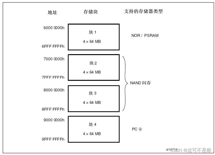 如图所示,NOR/PSRAM的地址范围为 0x60000000~0x6FFFFFFF。NOR/PSRAM又分为4个存储块,如下图所示,存储块的选择由地址的26和27位控制。