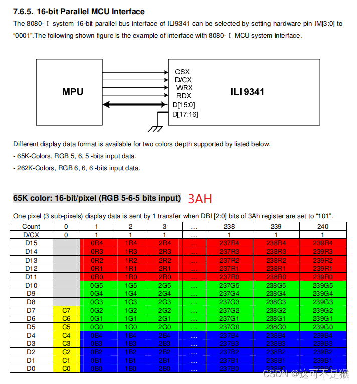 在控制方式上,一般采用16位控制方式(RGB565)。可详读ILI9341数据手册,在3AH寄存器中可进行配置。
