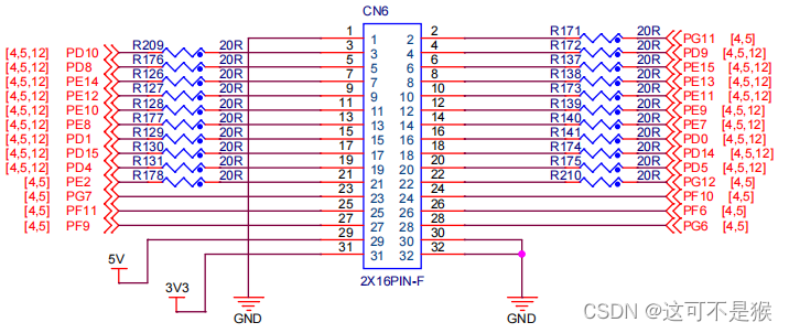 而本次使用的开发板与8080数据命令引脚连接的引脚为PE2(FSMC_A23),对应地址位为HADDR[24]。片选引脚为FSMC_NE4,HADDR[27:26]=11。存储块为NOR/PSRAM 4 ,令地址位的第24位为0时表示命令模式,即0x6C000000;数据模式:0x6D000000。