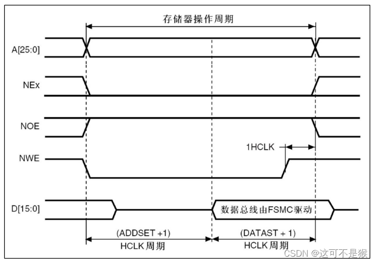 当我们在该地址上写入数据时,FSMC便会控制数据线输出对应的数据,读取数据时,也可直接读取对应的地址即可。