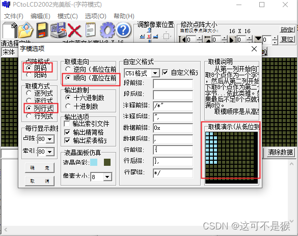 在编写显示函数前,先制作ascii码字库,然后根据字库的显示配置编写显示函数。这里采取的阳码格式,1为点亮(1画一个点,0不画点);高位在前行列式,先在一列中画一个字节像素点,高位在最前面,随后绘制下一列。