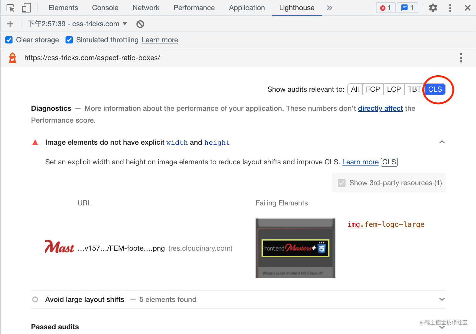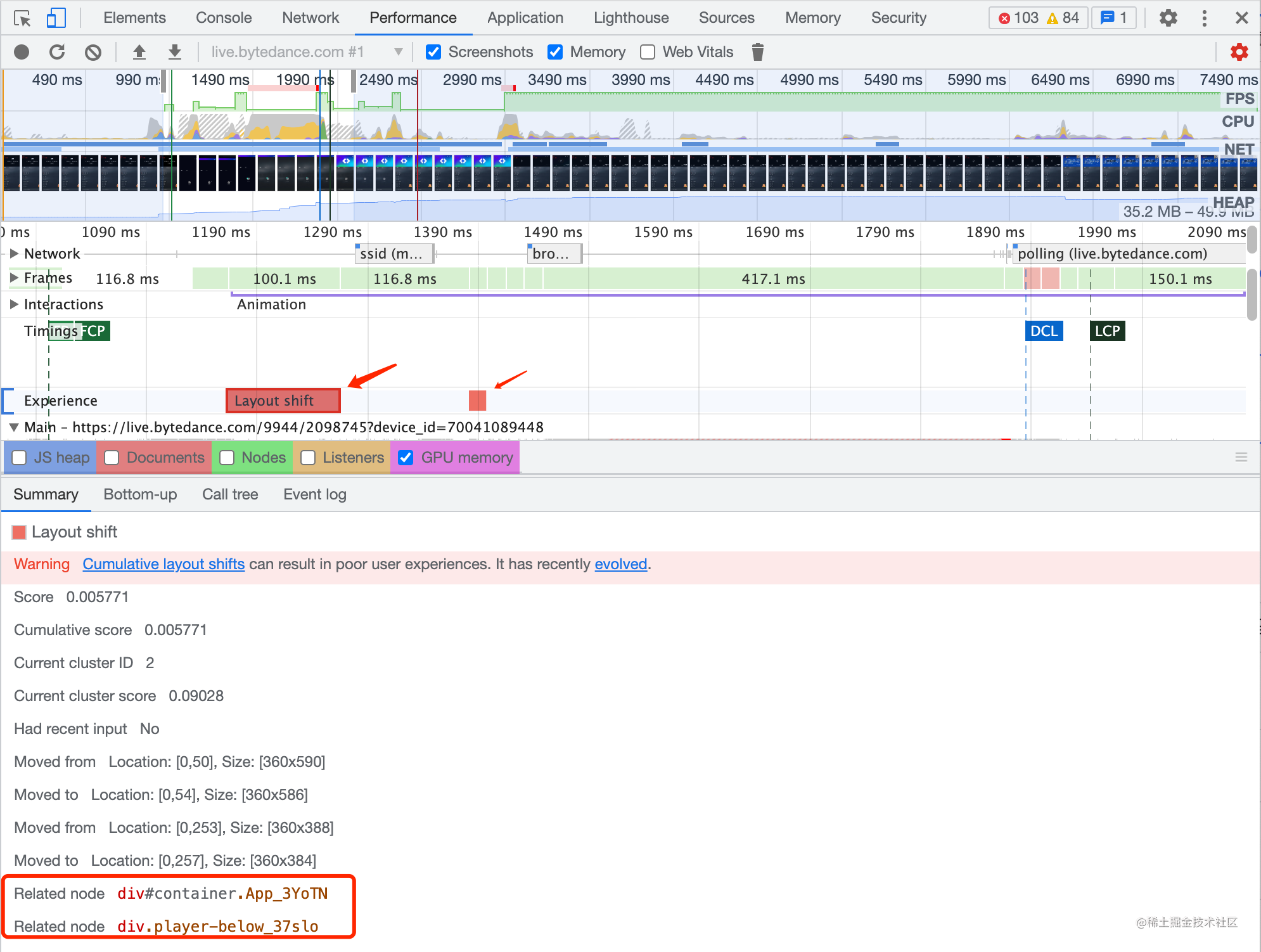 累积布局偏移,简称 CLS。其计算自未在用户输入 500 毫秒内发生的布局偏移的偏移分数总和,通过其值来表示测量内容的不稳定性,其值越高稳定性越差。通常分数在 0.1 内为高稳定性表现。
