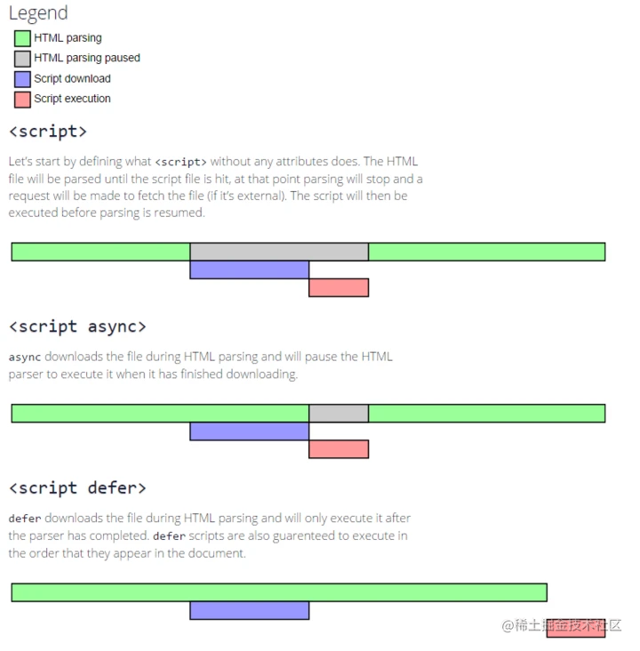 defer :并行下载,但下载完成后不会立即执行,它们在 DOM 解析完成之后、DOMContentLoaded 之前按照引入顺序依次执行,因此不会阻塞 DOM 解析。
