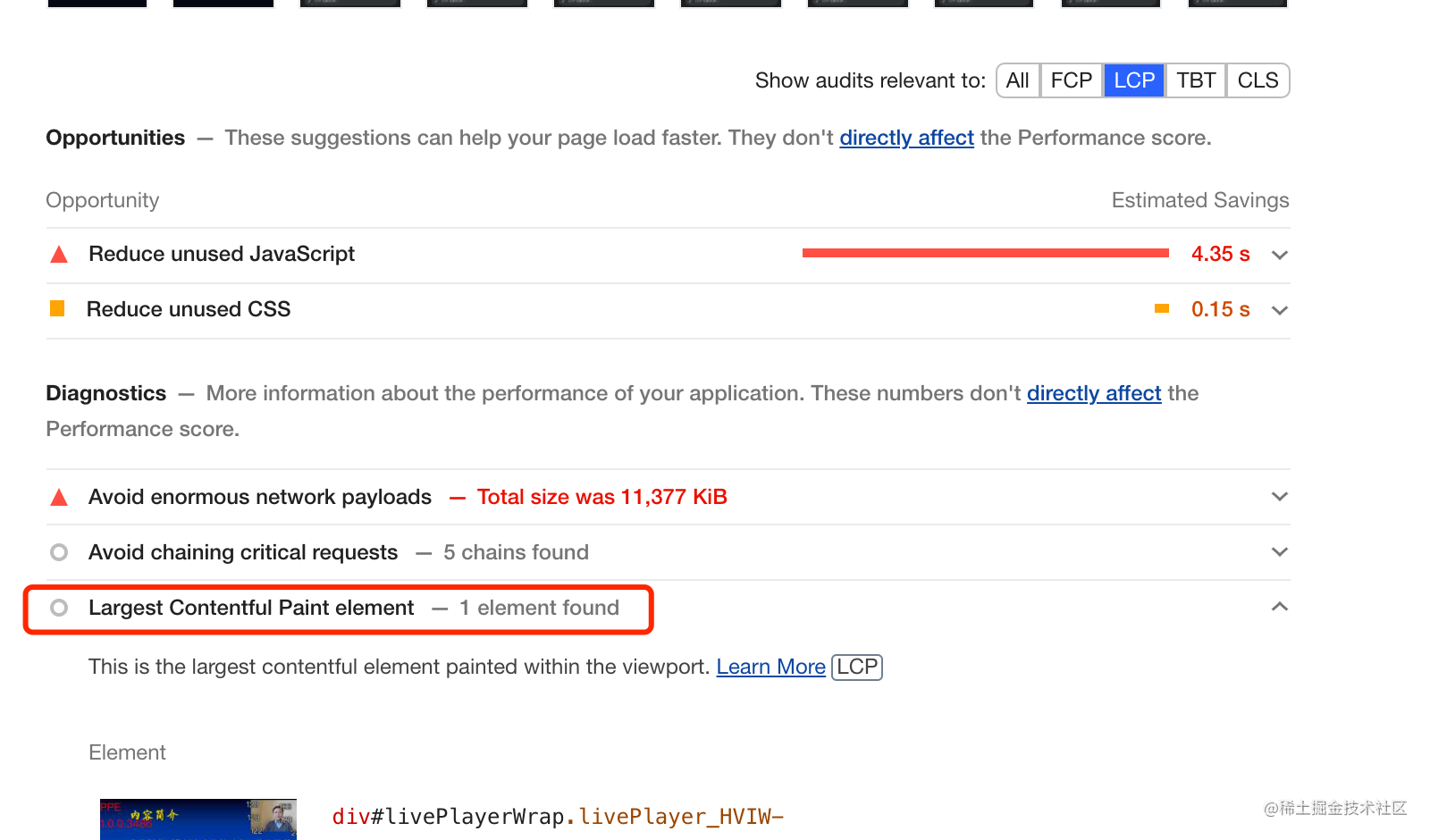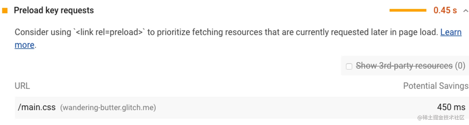 关键请求链表示浏览器优先处理和获取的资源的顺序,Lighthouse 会将位于链中的第三层资源标记为你预加载链接的候选名单,并在 Lighthouse 报告的 Opportunities 部分的 Preload key requests 中进行展示: