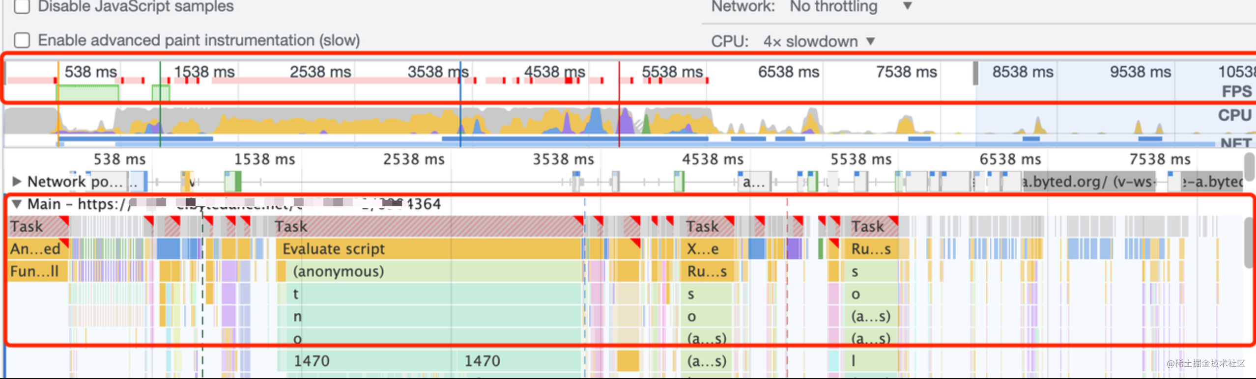 影响分:前一帧和当前帧的所有不稳定元素的可见区域集合(占总可视区域的部分)就是当前帧的影响分。上图中灰色背景标识的元素在一帧中占据了可视区域 50%,在下一帧中,元素下移了可视区域高度的 25%,红色虚线矩形框表示两帧中元素的可见区域集合,即该集合占总可视区域的 75%,因此其影响分数为0.75 。