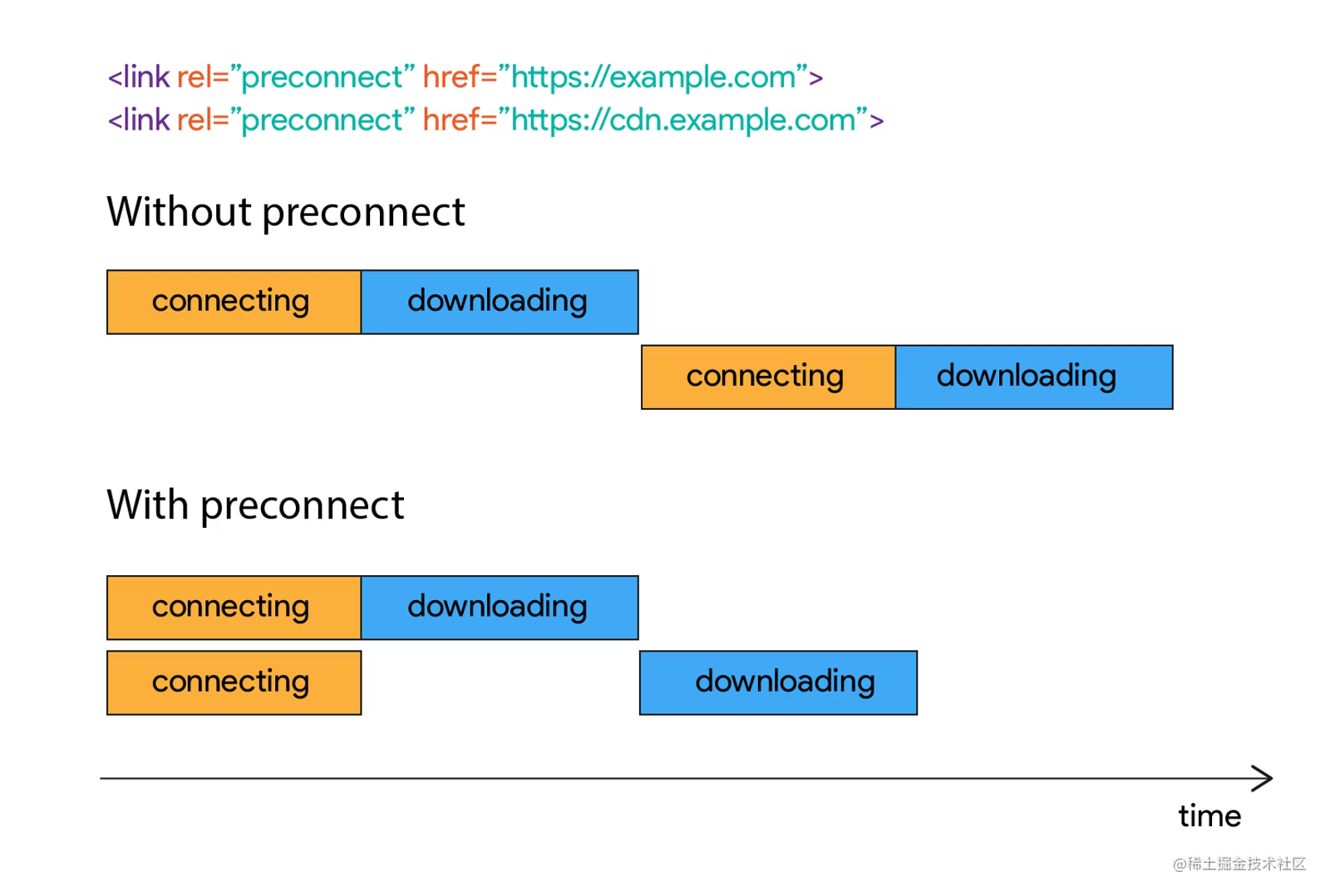 打开一个网页时,浏览器从服务器请求 HTML 文档,然后解析其中内容,如其中存在其他引用的资源则会单独发起请求,比如 CSS 中的自定义字体资源。对于那些较晚被解析发现的资源,可能包含了我们认为的关键资源,所以我们希望能告知浏览器提前去请求这些关键资源,从而就可以加快加载过程。通过 `<link rel="preload">` 预加载资源就可以实现。