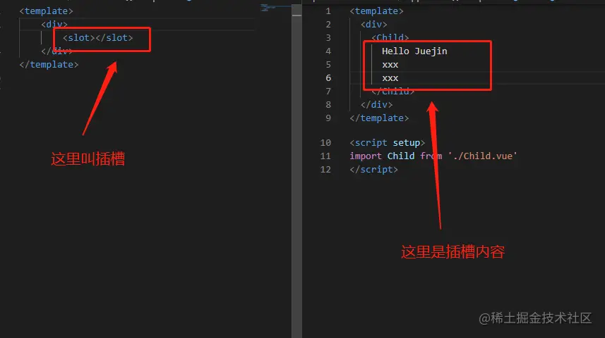 先解释一下后面频繁出现的两个词 插槽和插槽内容,防止后面阅读搞混了: