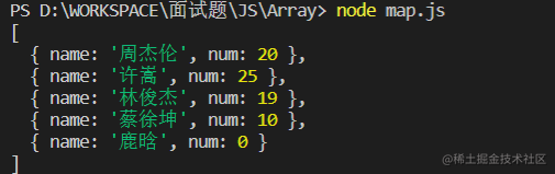 const singer = [{ name: '周杰伦', num: 20 },{ name: '许嵩', num: 25 },{ name: '林俊杰', num: 19 },{ name: '蔡徐坤', num: 10 },{ name: '鹿晗', num: 0 },]const newSinger = singer.map((item, index, arr) => {return item})console.log(newSinger);