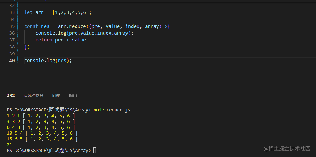 const res = arr.reduce((pre, value, index, array)=>{console.log(pre,value,index,array);return pre + value