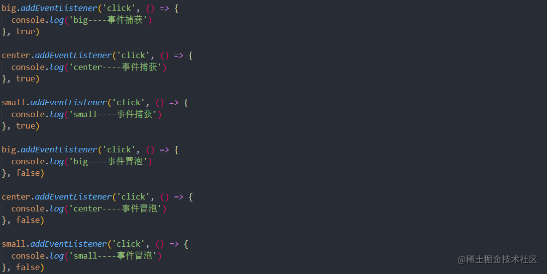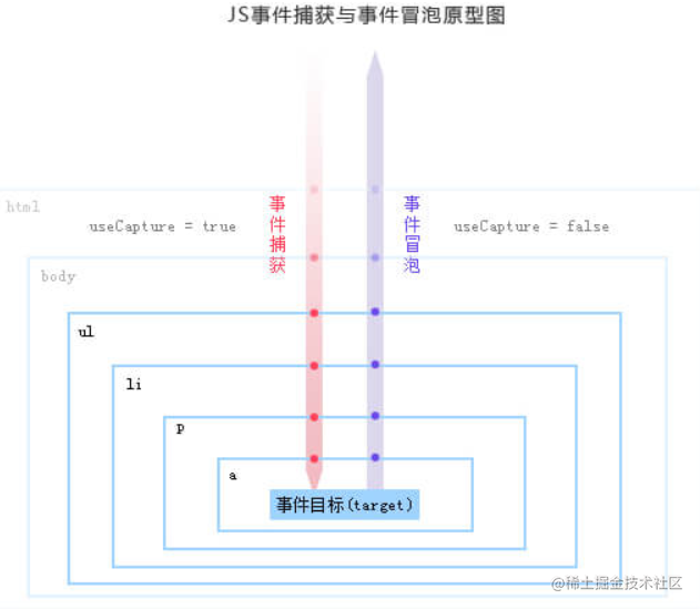 事件捕获(event capturing): 当鼠标点击或者触发dom事件时(被触发dom事件的这个元素被叫作事件源),浏览器会从根节点 =>事件源(由外到内)进行事件传播。