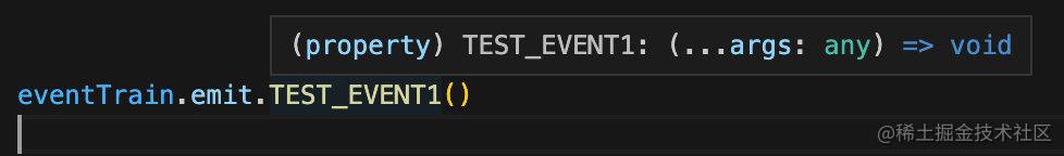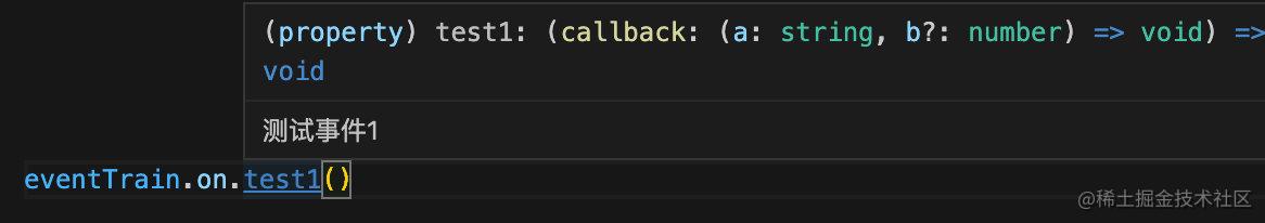 在前文当中,在对象 eventFunction 中定义了test1这个函数。eventTrain把它定义的类型挪了过来,挂载到了自己的.on.test1之上,从而约束订阅方法里的 callback 类型。