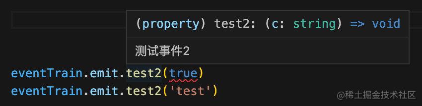 额外需要注意的是,如果emit里面传递了一个错误类型,比如 boolean,会有 ts error。比如第一行的eventTrain.emit.test2(true)。说明了这种订阅发布模式的使用方式拥有了强类型的联系。