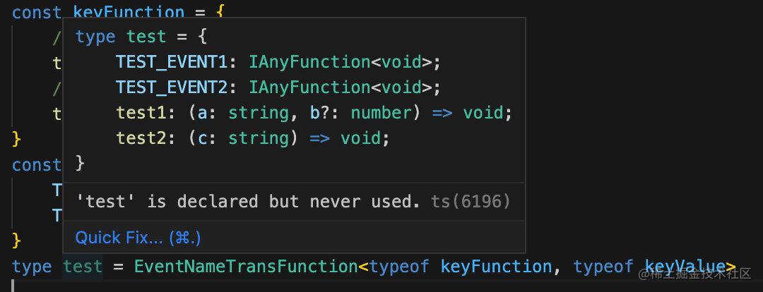 }, {// 函数式类型声明 eventNamekeyFunction: {/** 测试事件1 */test1: (a: string, b?: number) => {},/** 测试事件2 */test2: (c: string) => {}},// 传统方式声明 eventNamekeyValue: {TEST_EVENT1: 'TEST_EVENT1',TEST_EVENT2: 'TEST_EVENT2',}