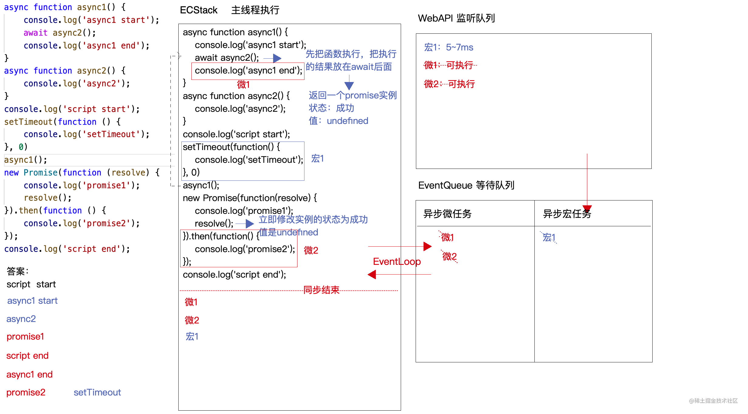 - 情况1:await后面的promise实例我们已知是成功的先把微任务放置在WebAPI中,但是知道是可以执行的,则直接在挪至到EventQueue中等待执行* 情况2:await后面的promise实例还是pending状态 此时我们把微任务放置在WebAPI中监听,等到后期promise实例是成功态后,再把它挪至到EventQueue中等待执行即可