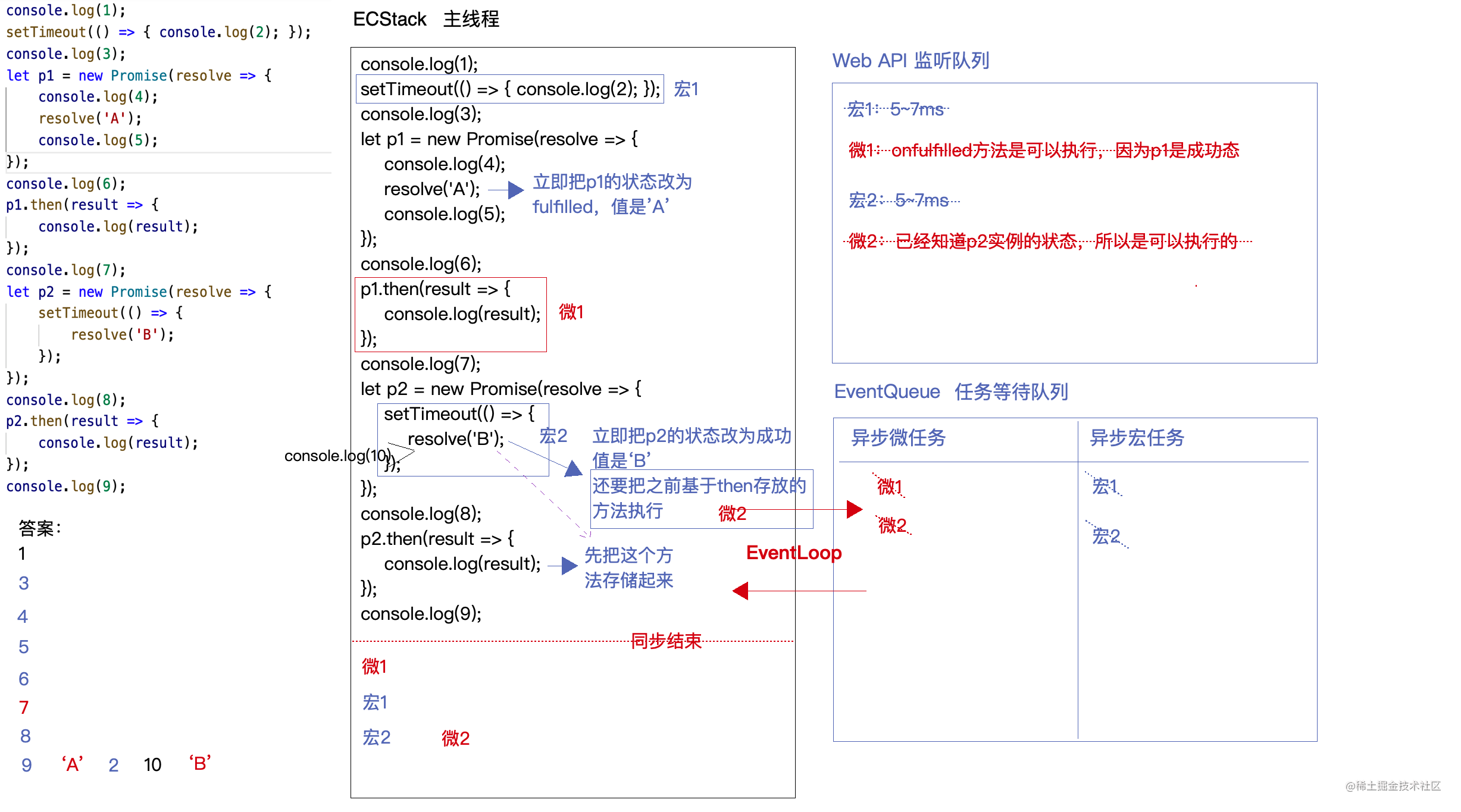 let p2 = new Promise(resolve => { //立即执行executor函数 setTimeout是异步则会放进WebAPI监听 宏2setTimeout(() => {resolve('B');console.log(10); //执行宏2=>@1 更改了p2的状态 @2之前存储的.then方法执行});