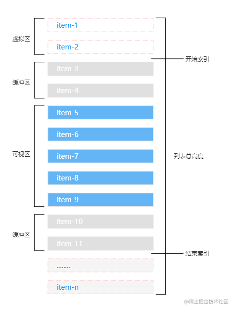 因为用于渲染页面元素的数据是根据 开始/结束索引 在 数据列表 中筛选出来的,所以只要保证索引的正确计算,那么渲染方式是无需变化的。* 对于开始索引,我们将原先的计算公式改为:在 缓存列表 中搜索第一个底部定位大于 列表垂直偏移量 的项并返回它的索引。* 对于结束索引,它是根据开始索引生成的,无需修改。实现