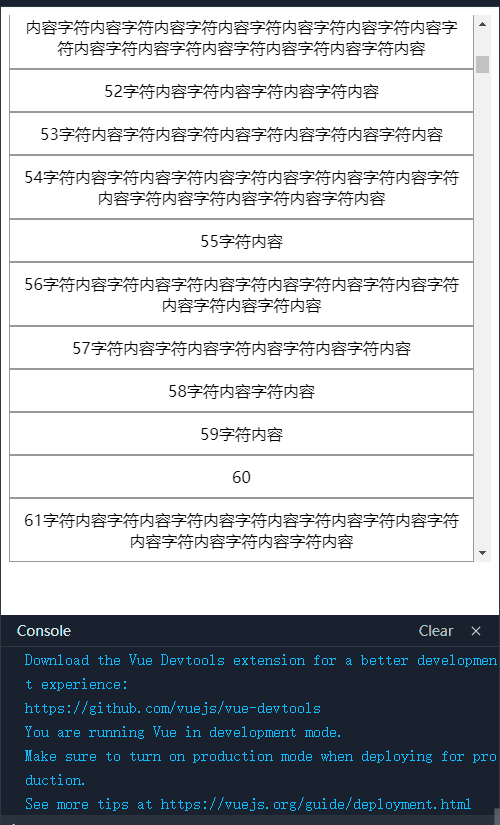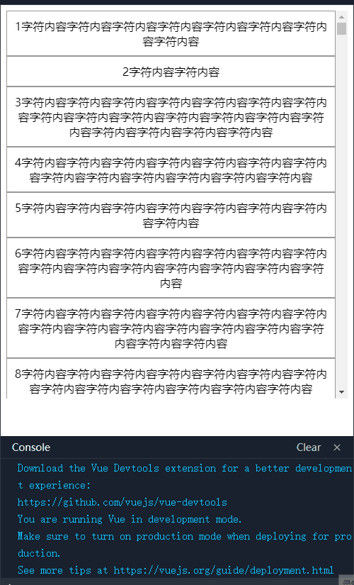 // 滚动回调scrollEvent(target) {const { scrollTop, scrollHeight, clientHeight } = target;this.start = this.getStartIndex(scrollTop);this.end = this.start + this.visibleCount;this.currentOffset = this.getCurrentOffset()// 触底if ((scrollTop +clientHeight) === scrollHeight) {// 模拟数据请求let len = this.listData.length + 1for (let i = len; i <= len + 100; i++) {this.listData.push({id: i, value: i + '字符内容'.repeat(Math.random() * 20) })}this.initPositions(this.listData, this.preItemSize)}},