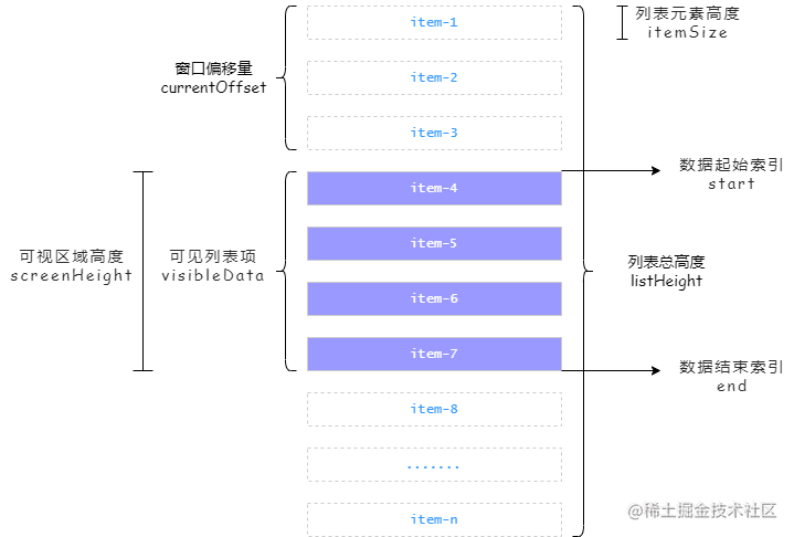 2.当前窗口偏移量currentOffset= scrollTop - (scrollTop % itemSize)