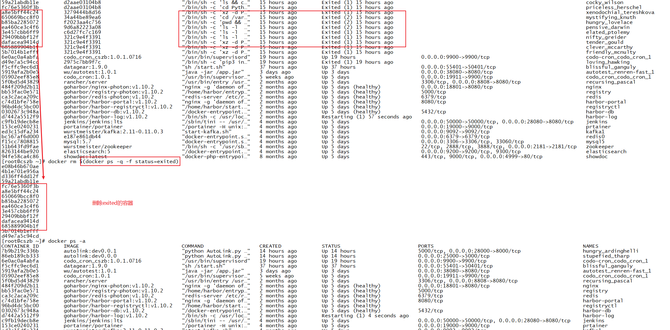 - docker rm $(docker ps -q -f status=exited) 删除exited状态的容器