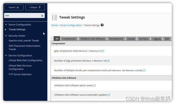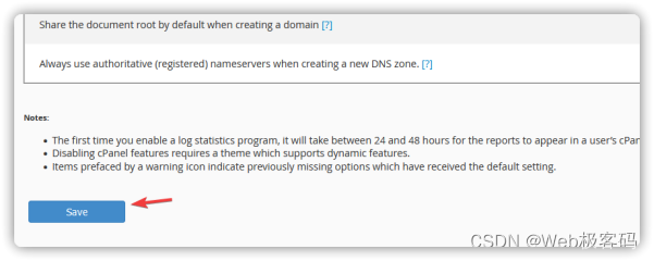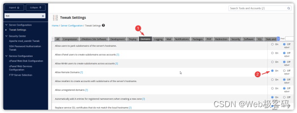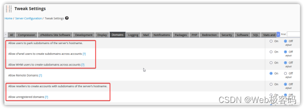 该选项还有其他的设置,例如Allow users to park subdomains of the server’s hostname(允许用户停放服务器主机名的子域),Allow cPanel users to create subdomains across accounts (允许cPanel用户跨帐户创建子域),Allow unregistered domains(允许未注册的域)。