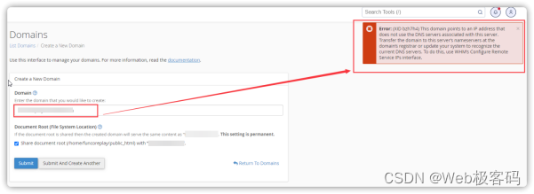 我们在上个星期遇到客户购买的Hostease的独立服务器包含WHM面板。但是当他在其创建的cPanel面板里添加新域名的时候,出现错误 This domain points to an IP address that does not use the DNS servers associated with this server.