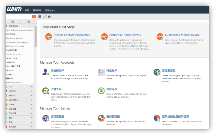 3.例如点击需要的中文后,从新登陆WHM面板后进入后台的界面会切换成中文