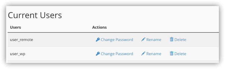该工具添加新MySQL用户并修改数据库,但我们感兴趣的是页面底部的“当前用户”部分。在这里,您会看到数据库用户的列表,并在操作列中有一个“Change Password”选项。