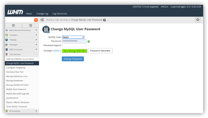 从下拉菜单中选择您要编辑的MySQL用户。输入并确认新密码。与root密码界面一样,“更改MySQL用户密码”界面也包含密码强度计和密码生成器。