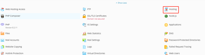 首先需要进入Windows主机的Plesk控制面板,在指定的域名下面找到“主机设置”,点击它开始下一步。