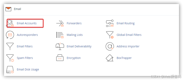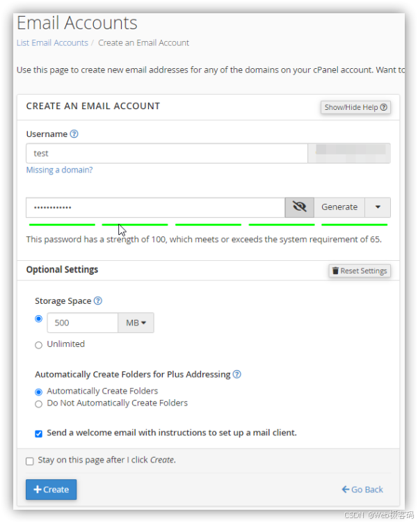 首先,登录cPanel并进入“电子邮件账户”页面。点击“创建”按钮,选择域名、用户名,并设置密码。点击“创建”后,系统会生成一个新的电子邮件账户。