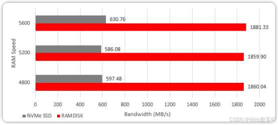 查看 PCMark 10 的数据驱动器基准测试,RAM 磁盘的带宽大约是 NVMe SSD 的三倍。