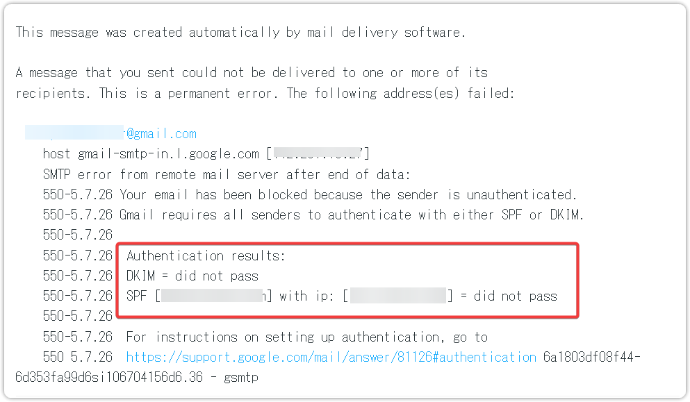 如果没有设置过SPF和DKIM的话,发送邮件可能会出现如下的退信内容: