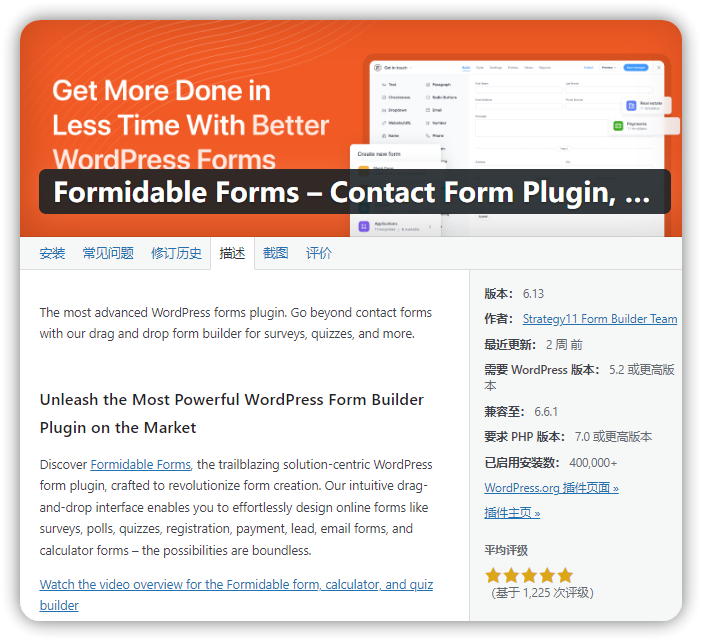 Formidable Forms 是一款功能全面的表单插件,不仅适合创建简单的反馈表单,还可以用于更加复杂的表单设计,如支付表单、计算器等。它支持强大的数据可视化功能,帮助你轻松展示反馈数据,生成图表报告,让你快速掌握用户的意见并做出相应调整。