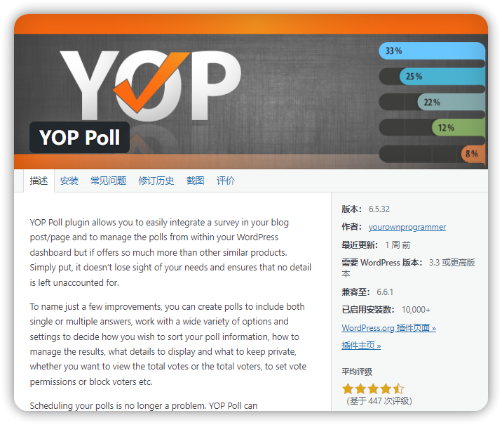 YOP Poll 是一款免费的投票插件,适合那些需要简单反馈功能的用户。它提供基础的投票和反馈功能,你可以自定义投票样式,并将其嵌入到网站任何页面。YOP Poll的操作非常简单,界面干净,适合小型网站或预算有限的用户使用。