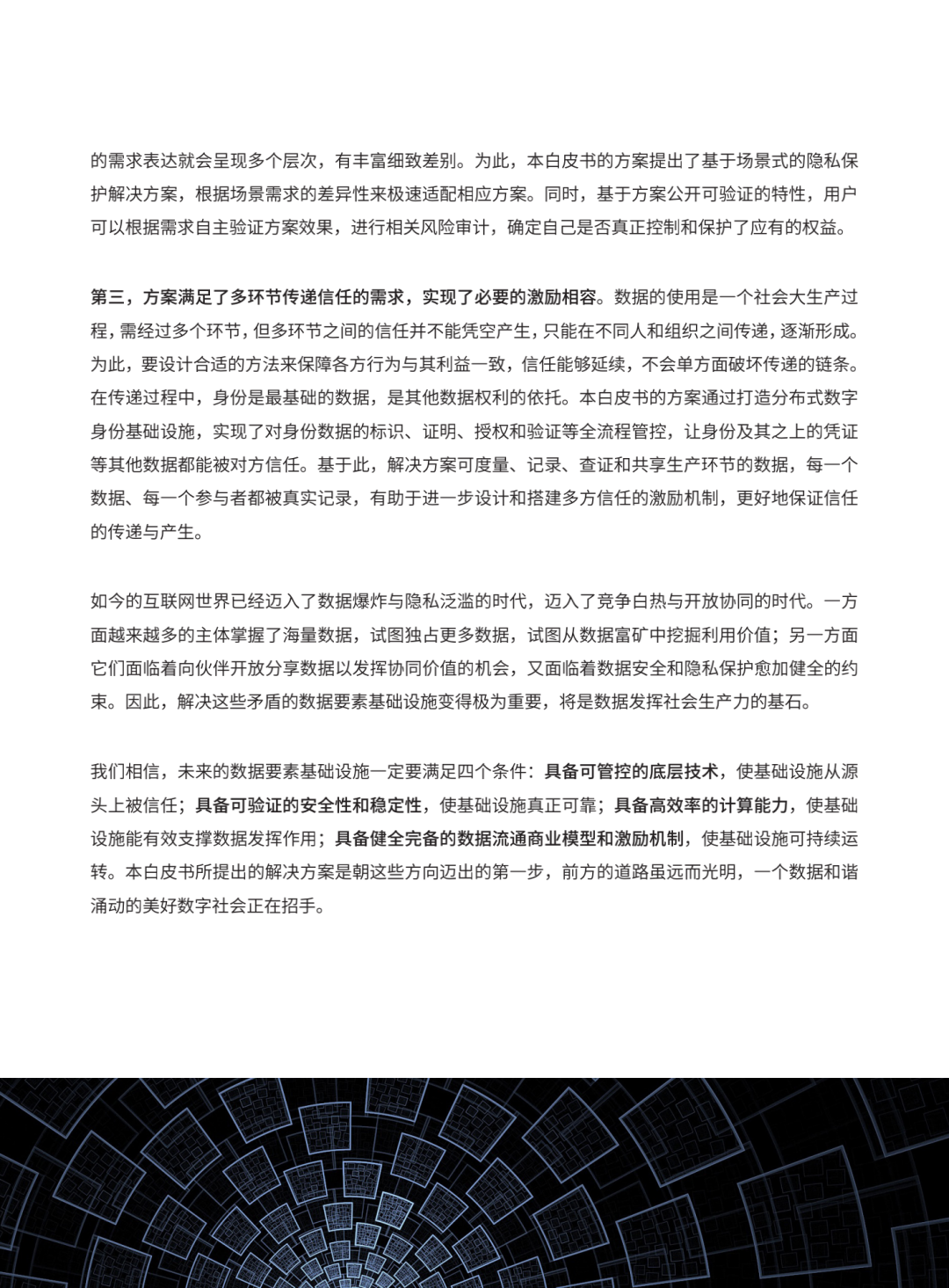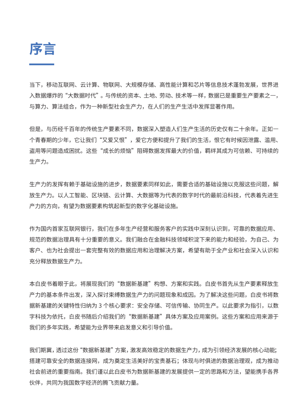 本白皮书着眼于此,将展现我们的“数据新基建”构想、方案和实践。白皮书首先从生产要素释放生产力的基本条件出发,深入探讨束缚数据生产力的问题现象和成因。为了解决这些问题,白皮书将数据新基建的关键特性归纳为 3 个核心要求:安全存储、可信传输、协同生产。以此要求为指引,以数字科技为依托,白皮书随后介绍我们的“数据新基建”具体方案及应用案例。这些方案和应用来源于我们的多年实践,希望能为业界带来启发意义和引导价值。