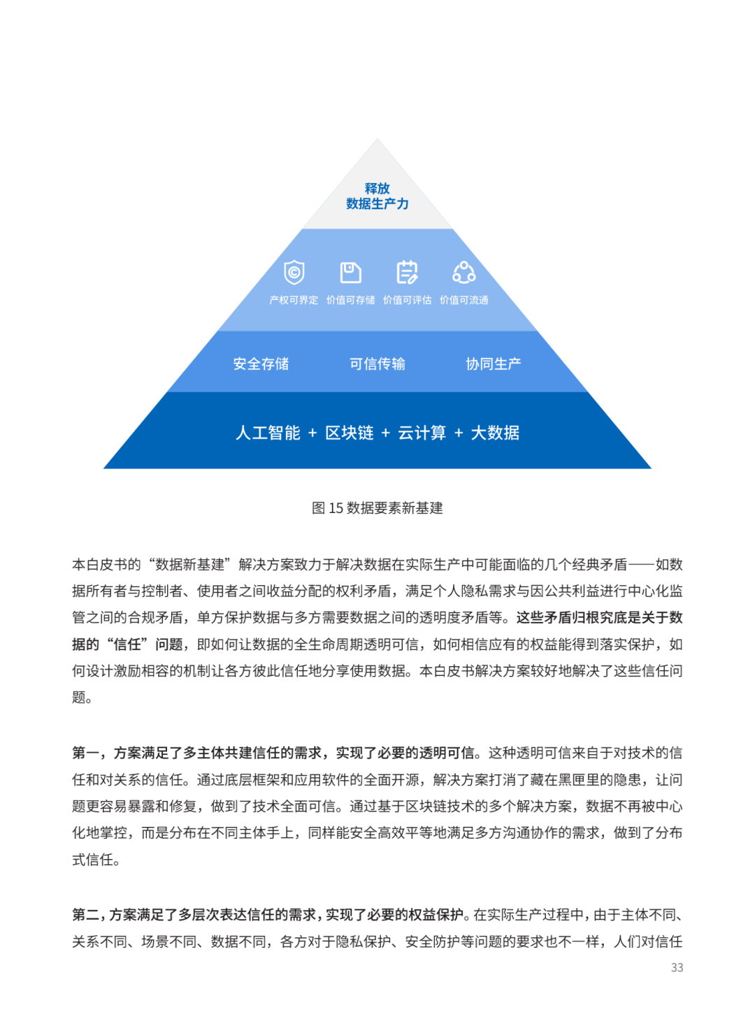 生产力的发挥有赖于基础设施的进步,数据要素同样如此,需要合适的基础设施以克服这些问题,解放生产力。以人工智能、区块链、云计算、大数据等为代表的数字时代的最前沿科技,代表着先进生产力的方向,有望为数据要素构筑起新型的数字化基础设施。